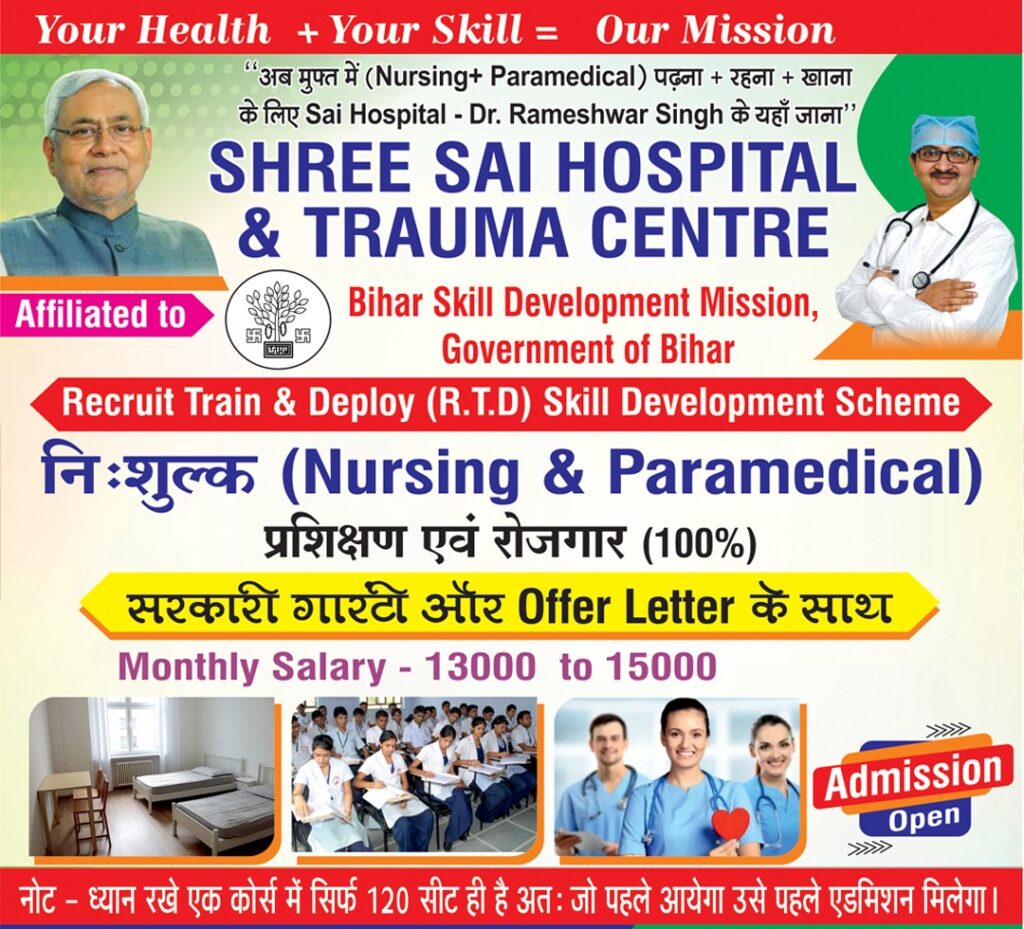 Sri Sai Hospital & Trauma Center is offering nursing & paramedical staff training in collaboration with Bihar Skill Development Mission. We are offering world-class training & skill development to untrained healthcare professionals and building a skill-based ecosystem in the medical industry.